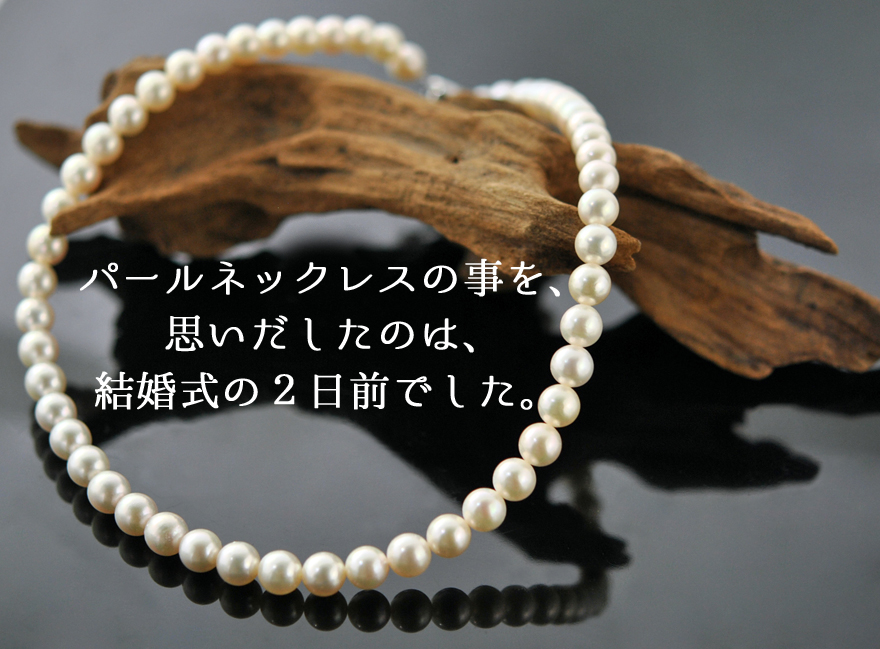 そのパールネックレスをつけて式に参列するのは、おすすめできません。パールネックレスの仕立て糸は、時間の経過とともに劣化いたします。ここぞの場面で切れないように、定期的にメンテナンスしましょう。