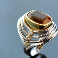 シトリンはイエローゴールドの器に留めこみ、発色をいちだんときわだたせ、サイドにはメレダイヤをあしらい、デザイン全体を引き締めました。